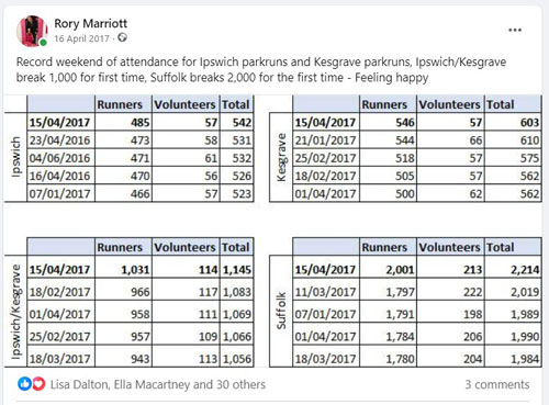 This was followed up by a couple of weeks at the home event during which time there were some pretty impressive stats for parkrun in both Ipswich/Kesgrave and for Suffolk as a whole.